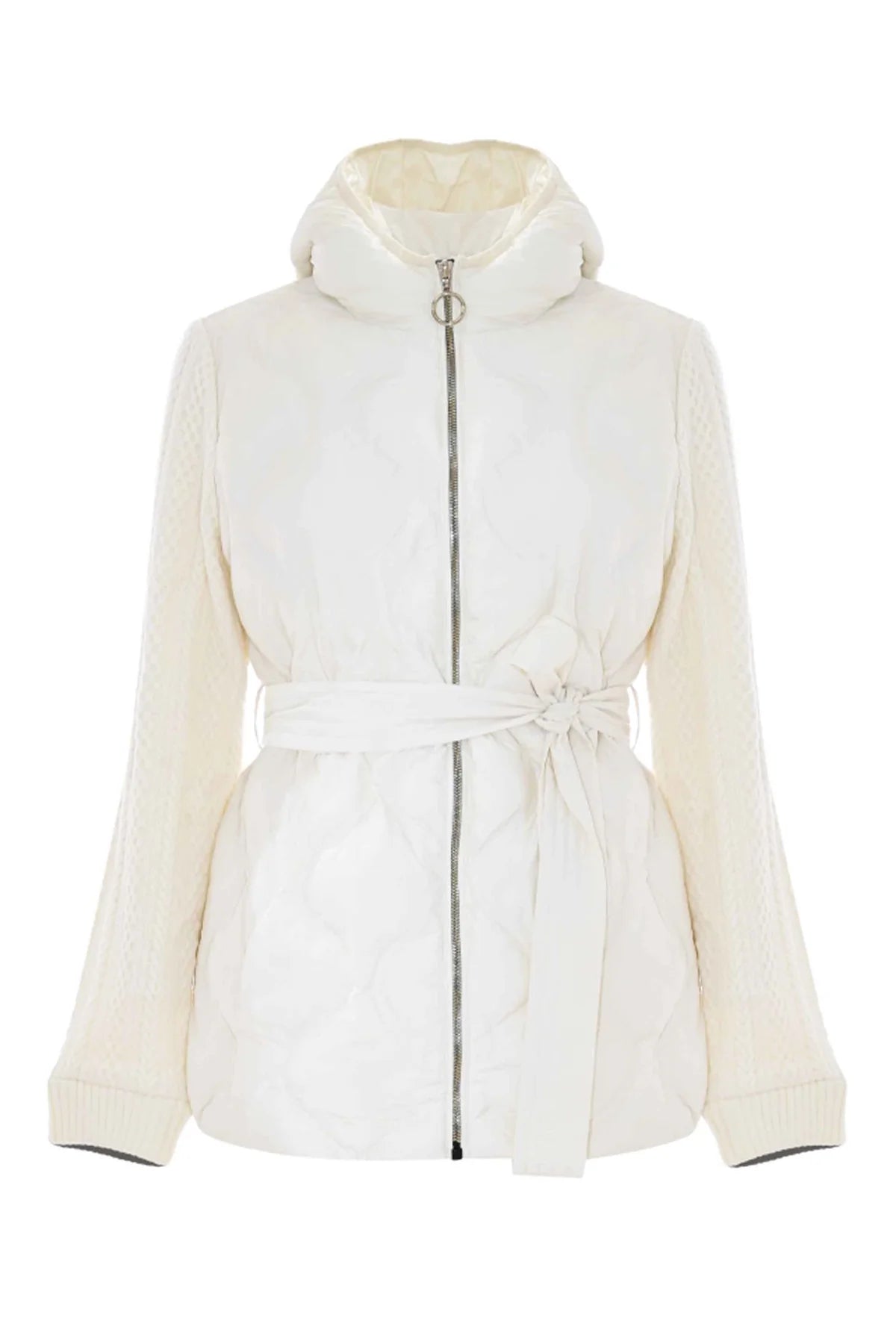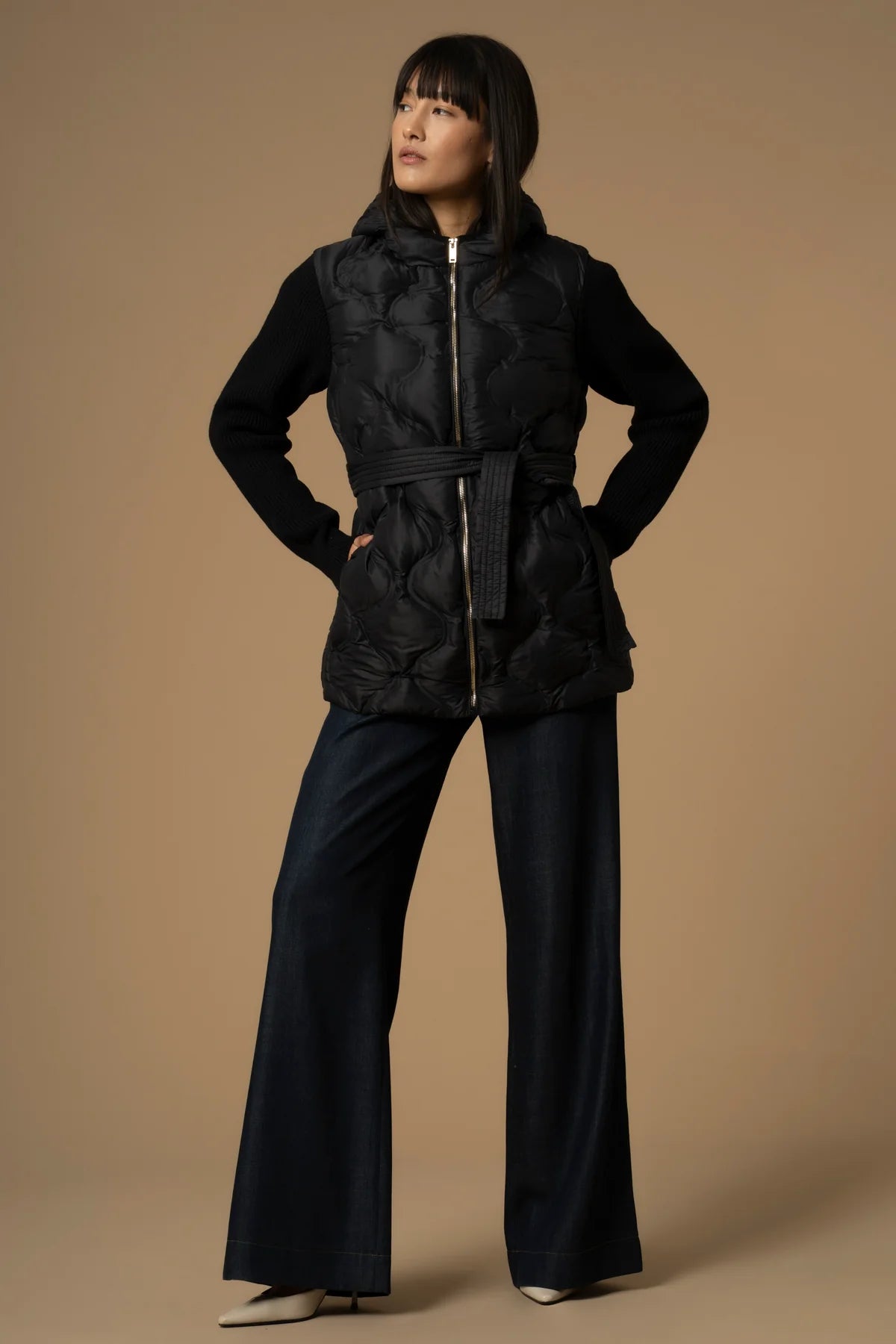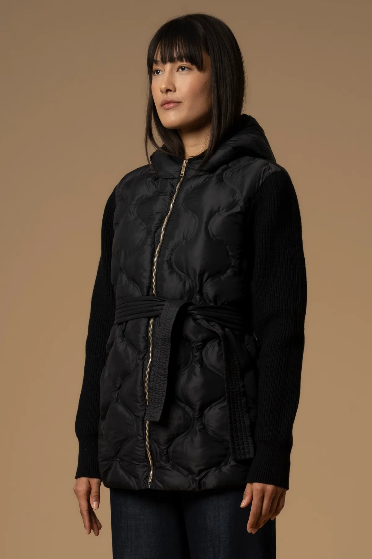 Questo giubbotto della capsule Pure Verve presenta la parte centrale con design piumino e le maniche in tessuto a costine. Il capo è caratterizzato dalla chiusura con zip, cintura da annodare in vita e cappuccio.