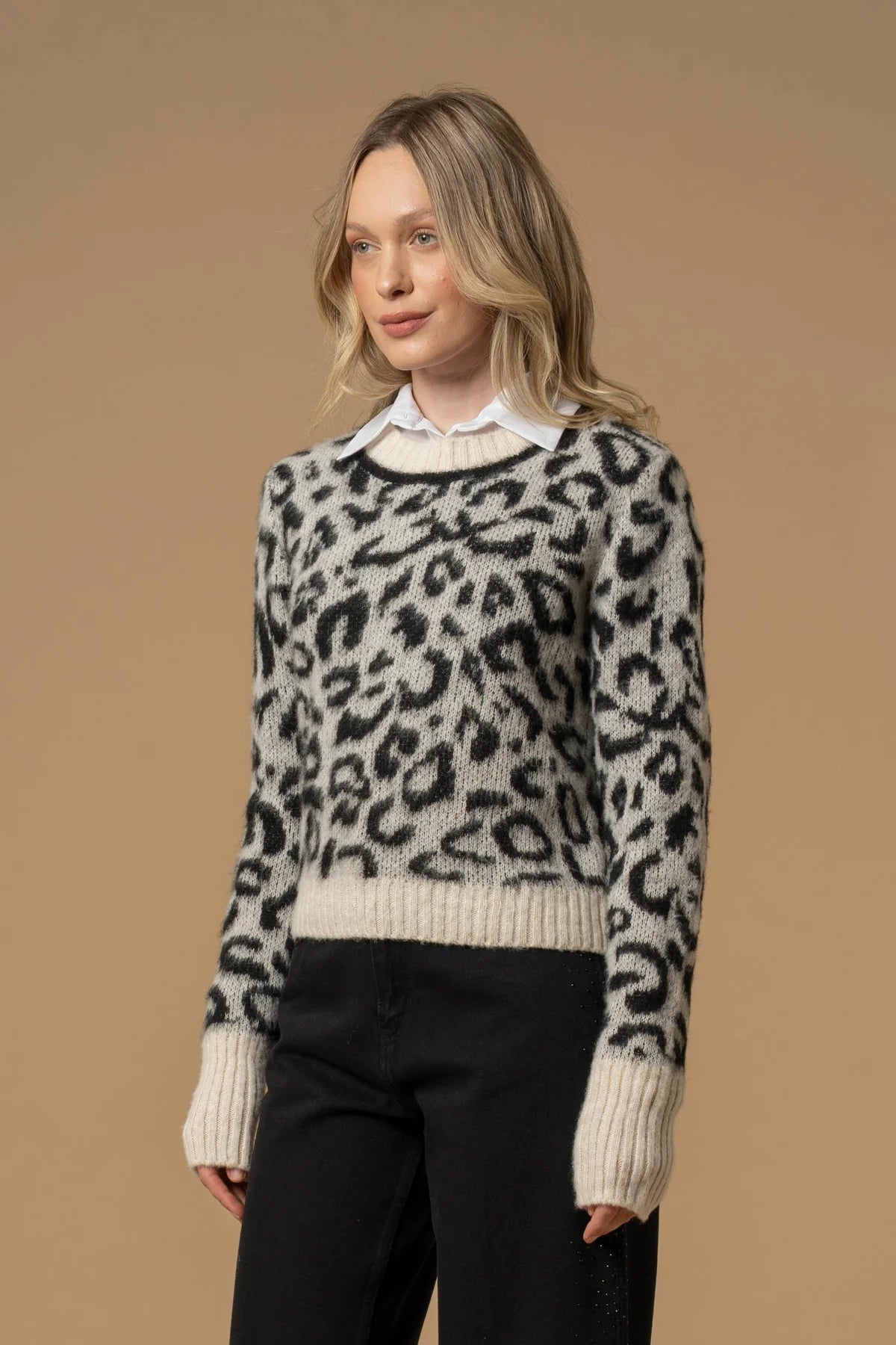 La modella è alta 175 cm e indossa una S/42Il design corto di questa maglia è impreziosito dalla stampa animalier che regala stile e grinta al capo. Il modello presenta bordi a costine in tinta unita e una vestibilità regolare.