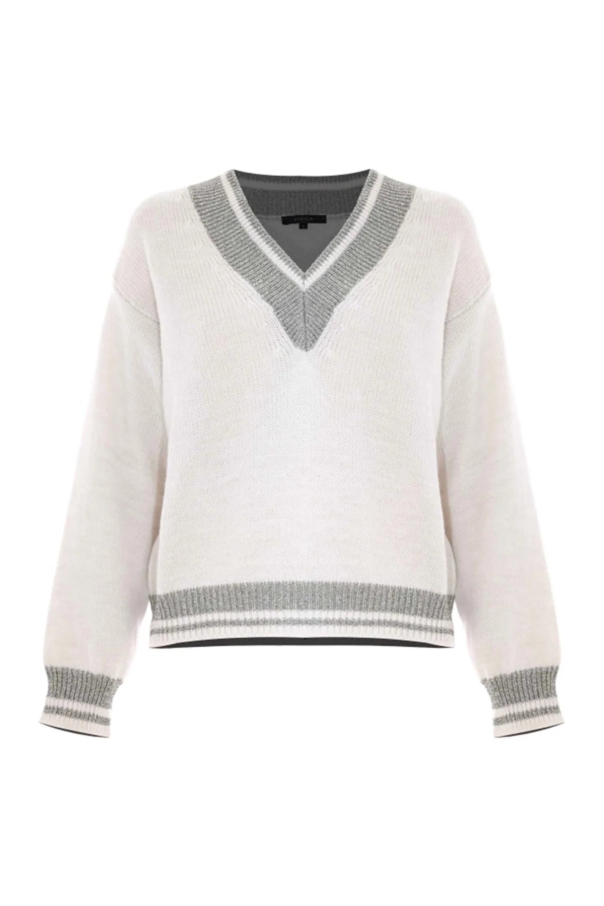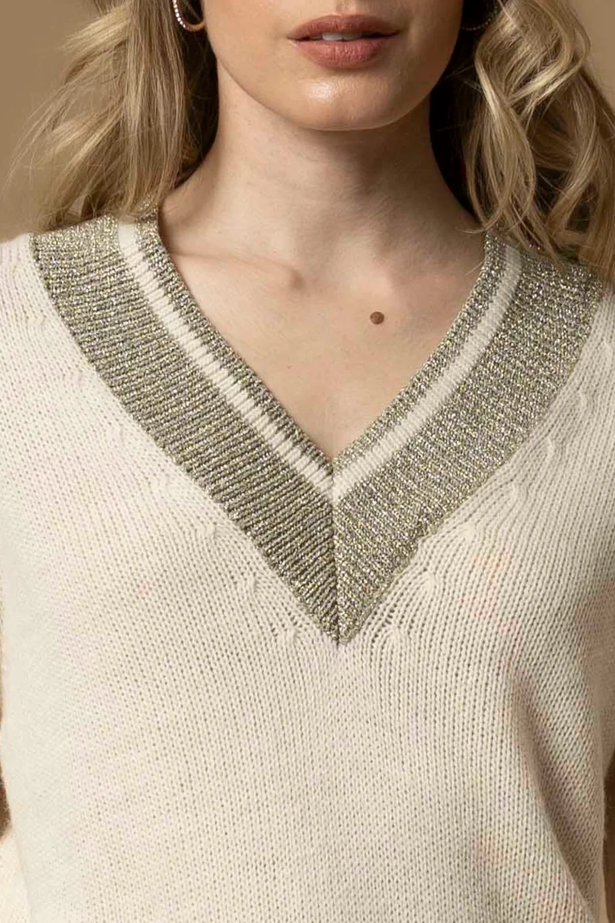 Perfetta per un daily look alla moda, questa maglia è caratterizzata dai bordi a costine in lurex, un dettaglio che regala stile e grinta al capo. Questo modello presenta un classico scollo a V, giromanica sceso e vestibilità rilassata.