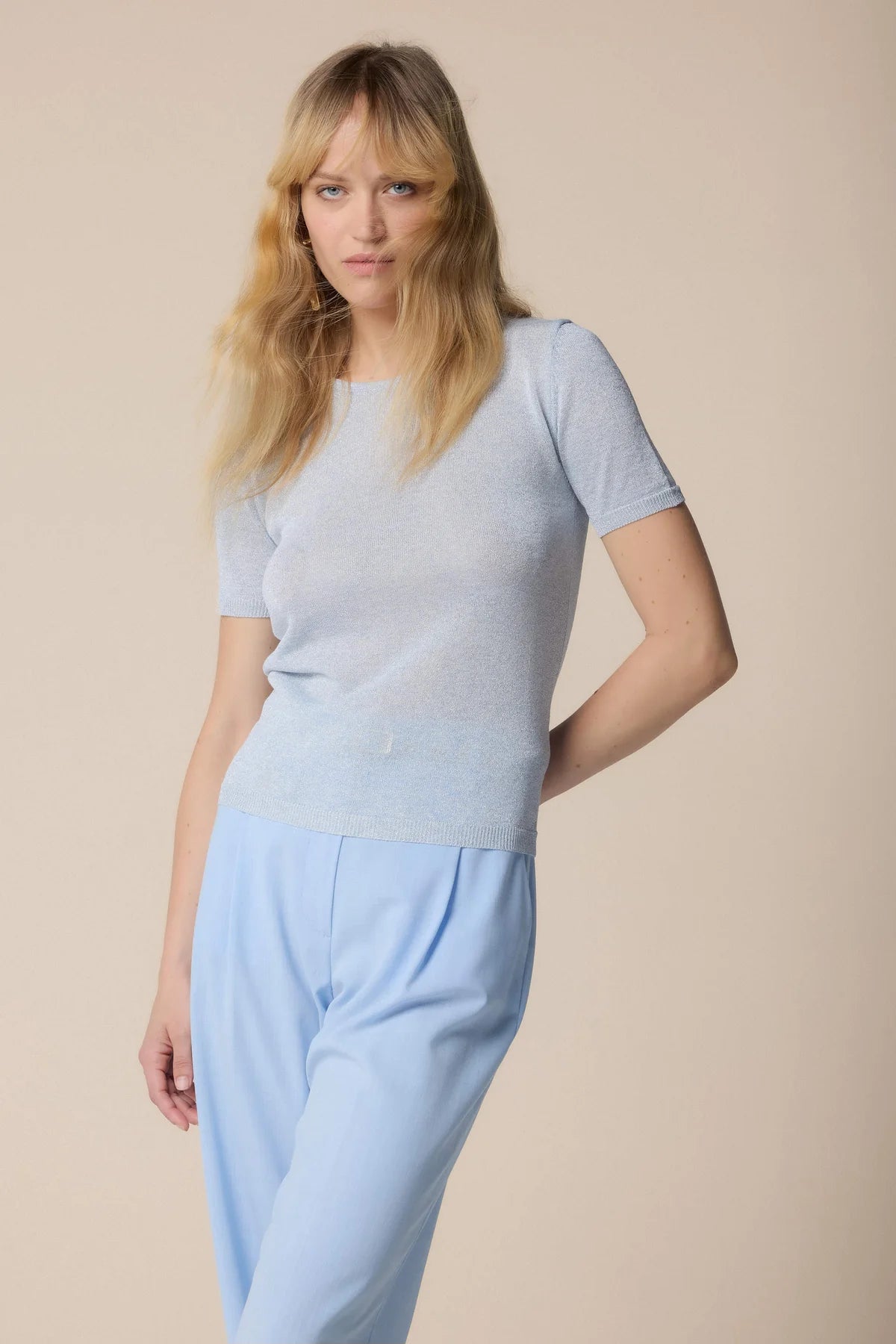 La modella è alta 176 cm e indossa una S/42/28Texture raffinata e stile essenziale per questa maglia a maniche corte con scollo rotondo e bordi a costine. È un capo basico, perfetto per un look casual e sofisticato.