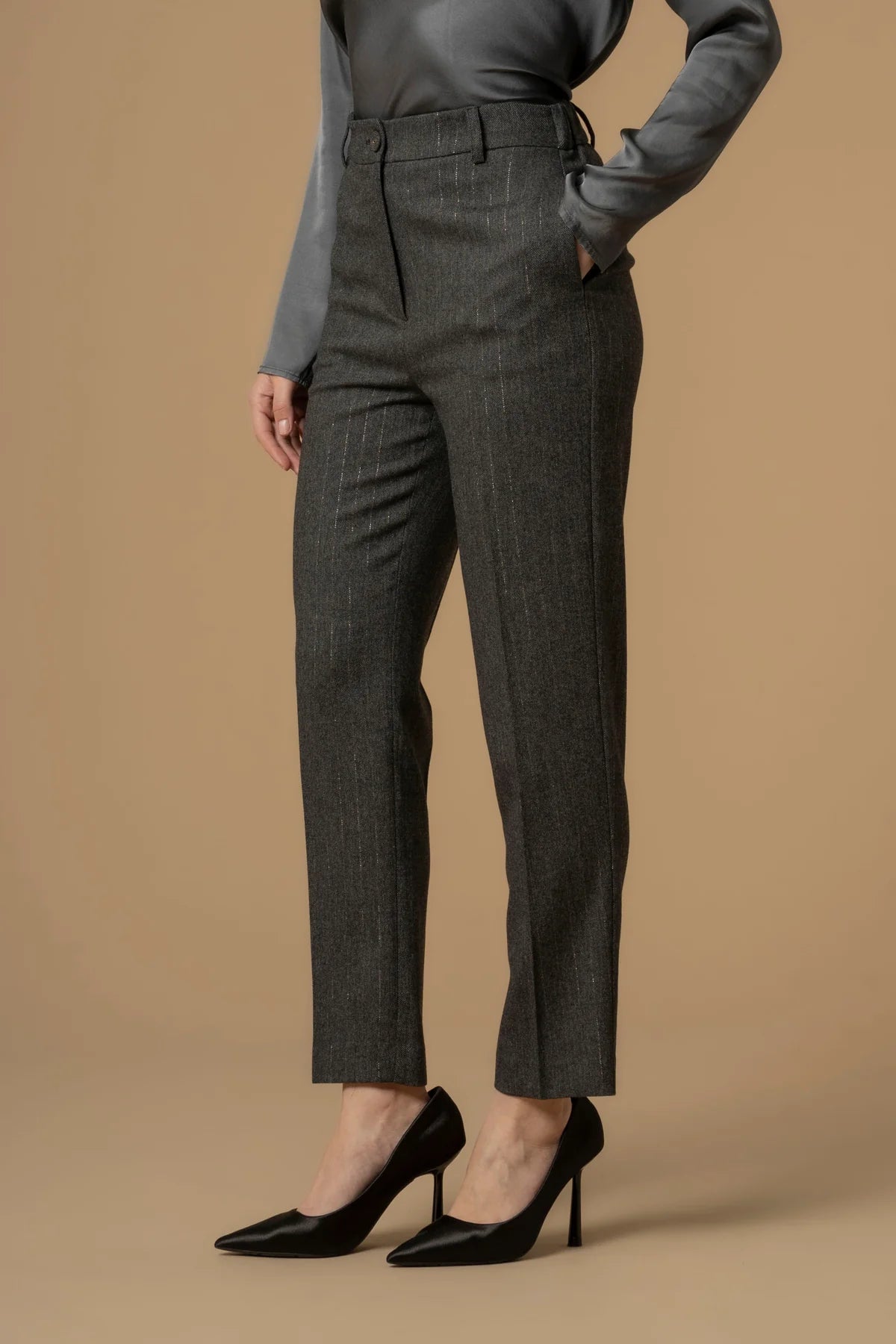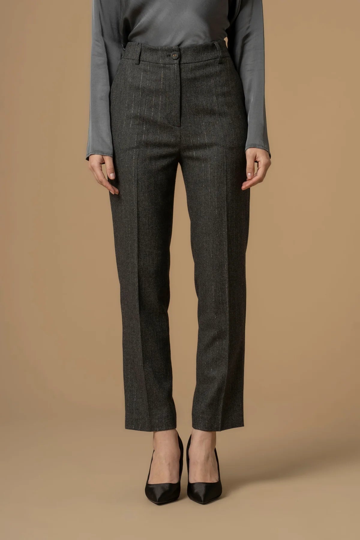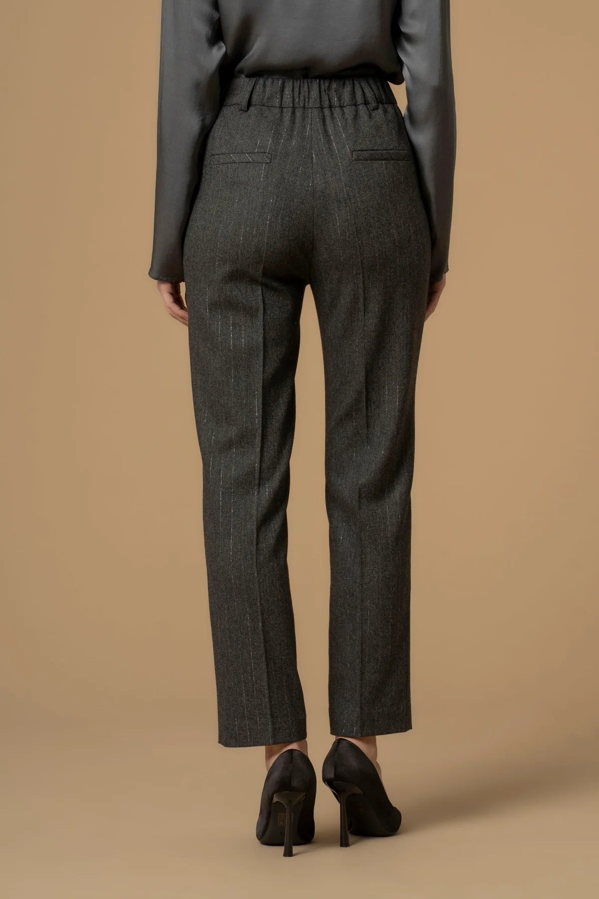 Il taglio dritto di questi pantaloni della capsule Pure Verve è impreziosito dalla riga gessata in lurex. Il capo, caratterizzato da un piacevole stile metropolitano, presenta fit dritto, piega stirata e chiusura con zip e bottone in tessuto.