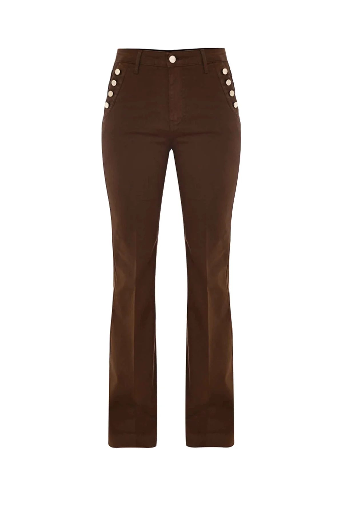 Lo stile eclettico di questi pantaloni con gamba leggermente ampia sul fondo, è sottolineato dalle tasche laterali impreziosite dai bottoni logati. Il capo presenta la piega stirata sul davanti e chiusura con zip nascosta e bottone.