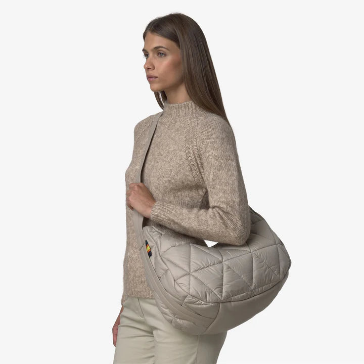 Didiane è una borsa hobo a spalla ideale per il quotidiano, il viaggio e il tempo libero. Realizzata in tessuto trapuntato idrorepellente con imbottitura leggera, presenta una tracolla confortevole, un interno capiente con tasche e una base resistente in materiale sintetico effetto pelle tono su tono.