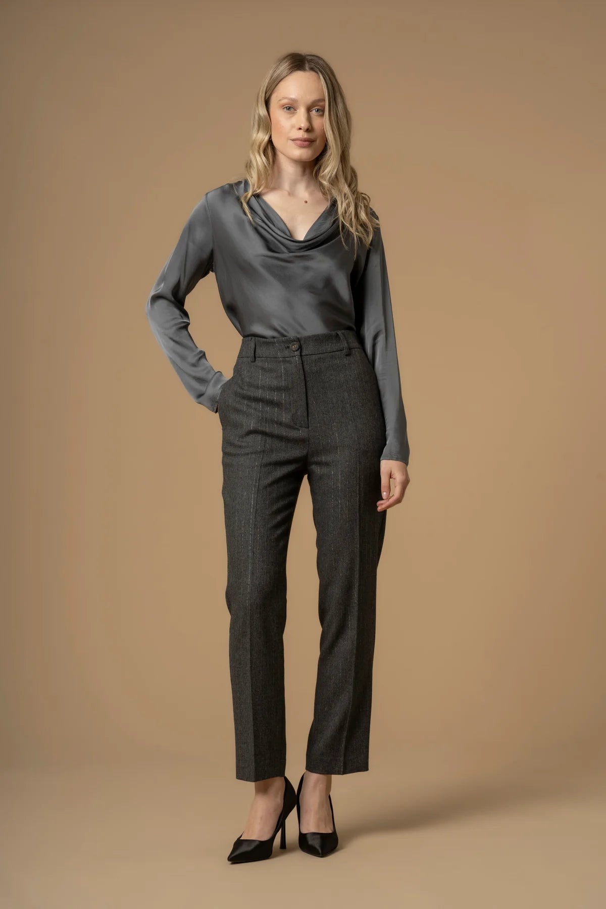 La modella è alta 175 cm e indossa una S/42Il taglio dritto di questi pantaloni della capsule Pure Verve è impreziosito dalla riga gessata in lurex. Il capo, caratterizzato da un piacevole stile metropolitano, presenta fit dritto, piega stirata e chiusura con zip e bottone in tessuto.