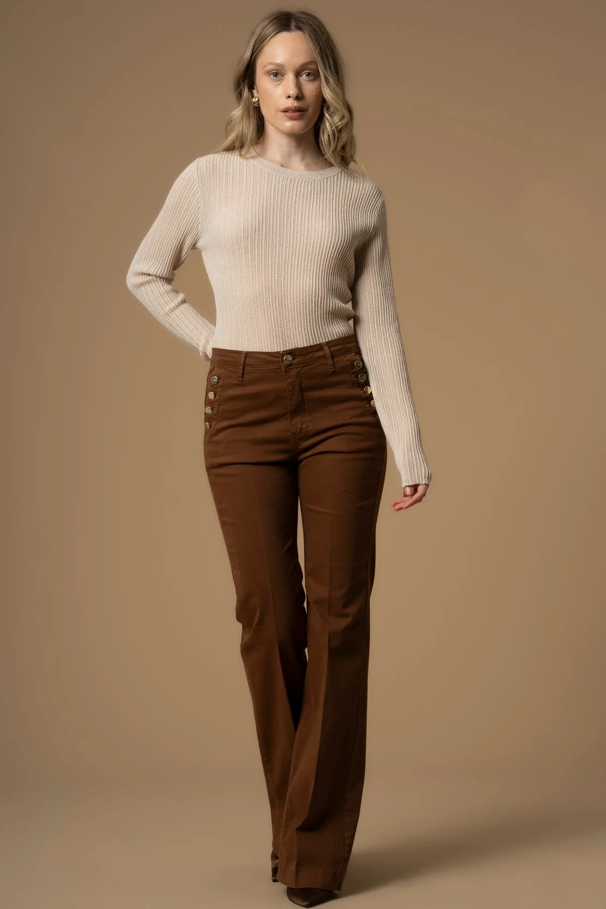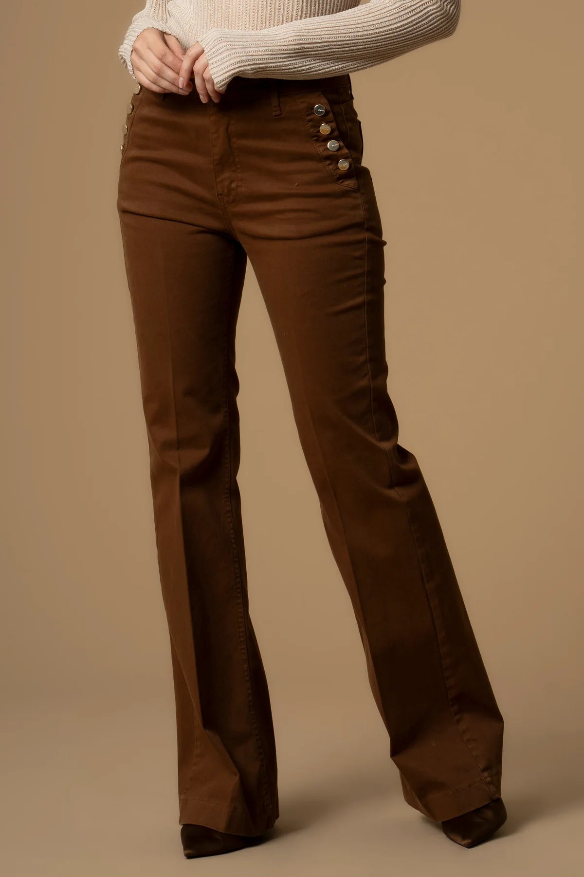 La modella è alta 175 cm e indossa una S/42Lo stile eclettico di questi pantaloni con gamba leggermente ampia sul fondo, è sottolineato dalle tasche laterali impreziosite dai bottoni logati. Il capo presenta la piega stirata sul davanti e chiusura con zip nascosta e bottone.